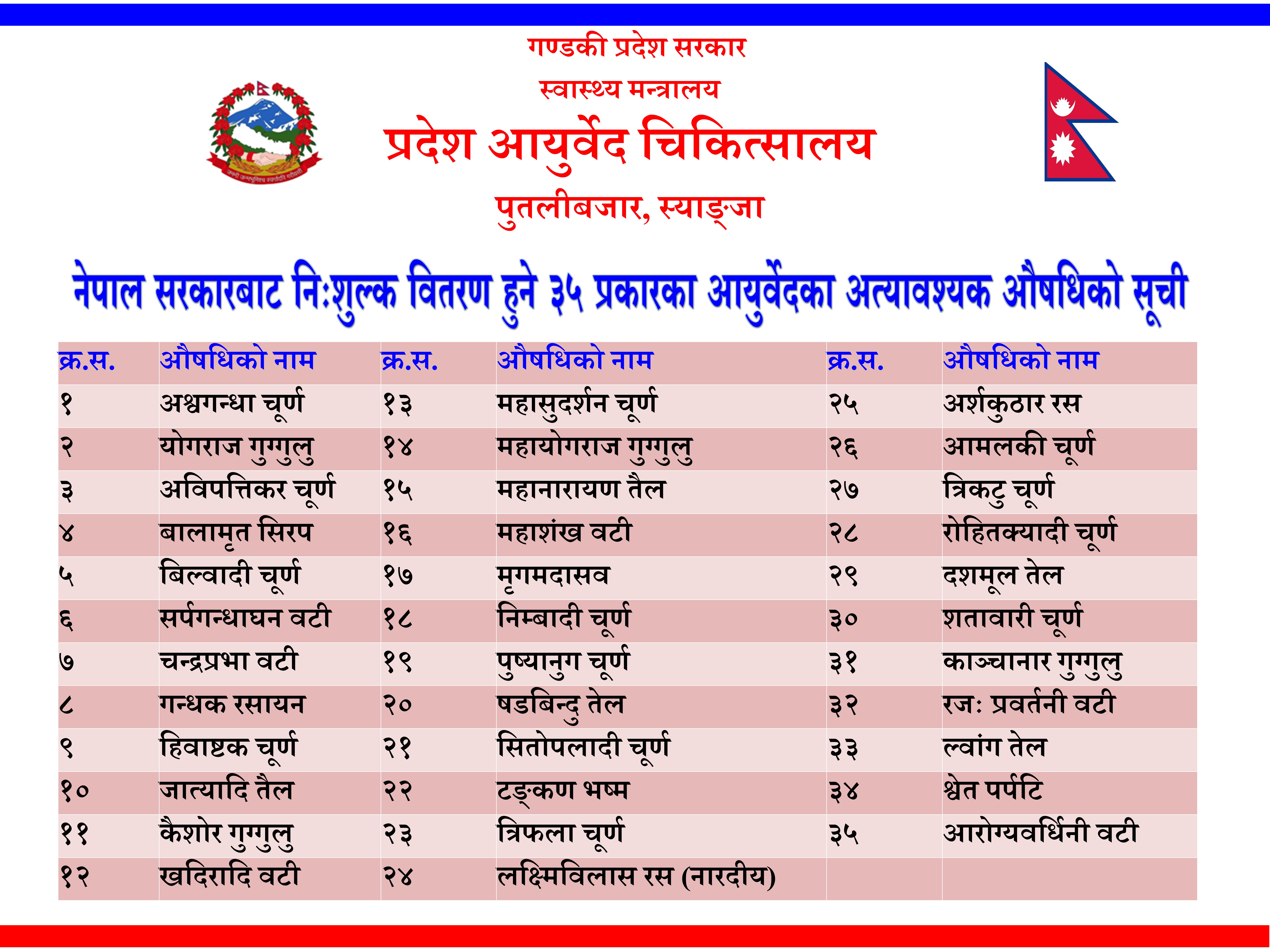 निःशुल्क वितरण गरिने ३५ प्रकारका आयुर्वेद औषधिको सूची